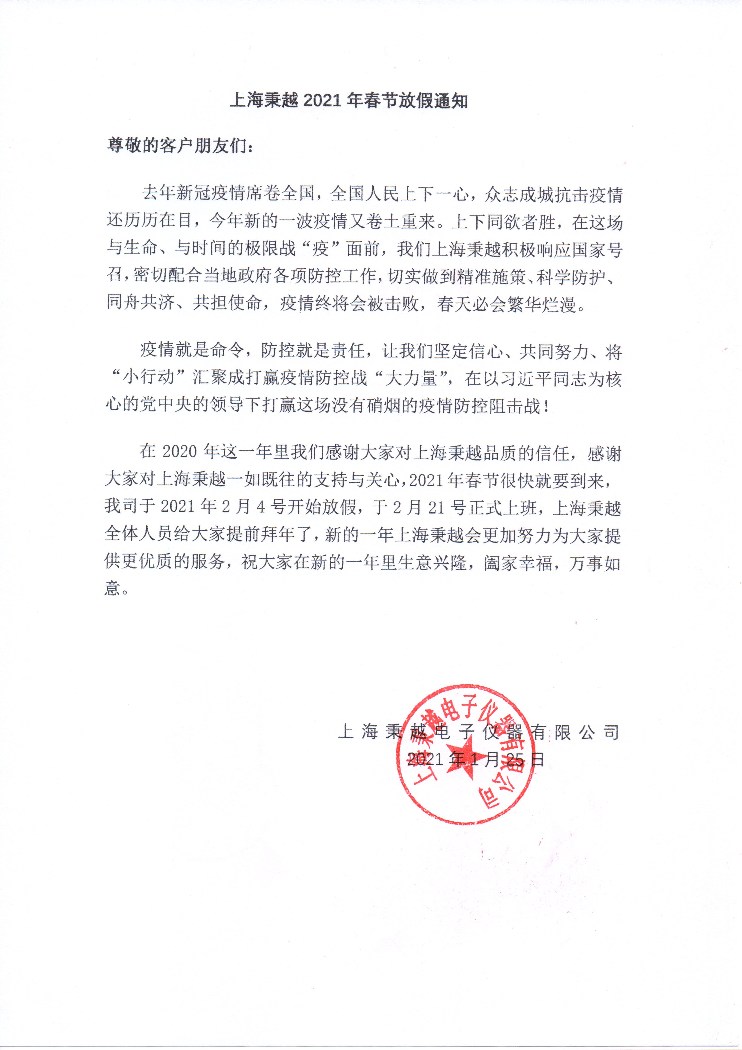 上海秉越2021年春節放假通知